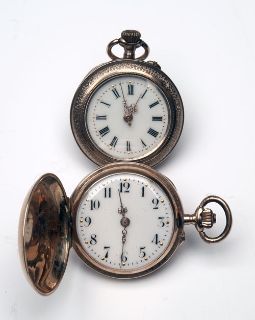 the first with full hunter 15K gold case and 10 jewel cylinder movement, the second of base metal with enamelled highlights and open faced, both with enamelled dials, the first with Arabic, the second with Roman numerals, both movements at fault