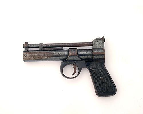 A .177 SPRING-PISTON AIR-PISTOL SIGNED WEBLEY, MODEL JUNIOR, batch no. 501, circa 1958, with blued 6in. barrel, adjustable rear-sight, blued air-chamber and chequered hard-rubber grips, retaining a fair amount of original finish