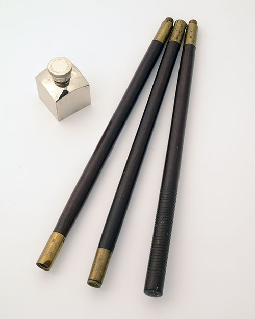 A NICKEL PLATED OIL BOTTLE (SIGNED PURDEY & SONS LTD) WITH VINTAGE THREE-PIECE CLEANING ROD