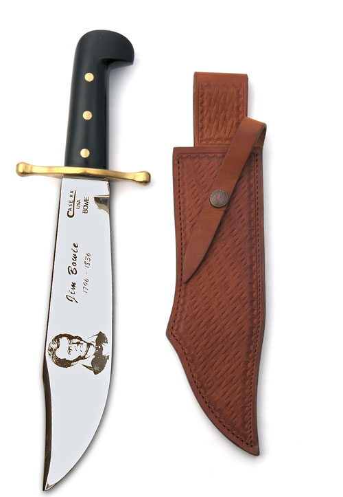 recent, with heavy polished 9 1/2in. blade etched with a bust of Jim Bowie together with the dates '1796-1836', the forte stamped 'CASE XX USA BOWIE', heavy brass cross-guard with swollen finials, black hard rubber grip-piece held by three brass rivets (some slight storage marks) TOGETHER WITH a tooled leather scabbard and a flock-lined display carton (outer faded)