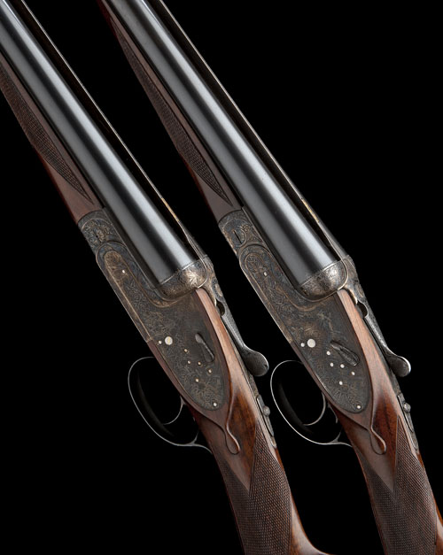 25in. nitro chopperlump barrels with matt Churchill-ribs, 2 3/4in. chambers, bored approx. imp. cyl. and 1/2 choke (No. 538679) and full and 3/4 choke (No. 576908), automatic safeties, removable striker discs, hand-detachable lockplates, gold-inlaid cocking-indicators, non-selective single-triggers, fully engraved with floral and acanthus scroll motifs, retaining much original colour-hardening and finish, 14 1/2in. stocks, weight 6lb. 4oz. (No. 538679) and 6lb. 8oz. (No. 576908), in a lightweight 'V.C. type leather motor case