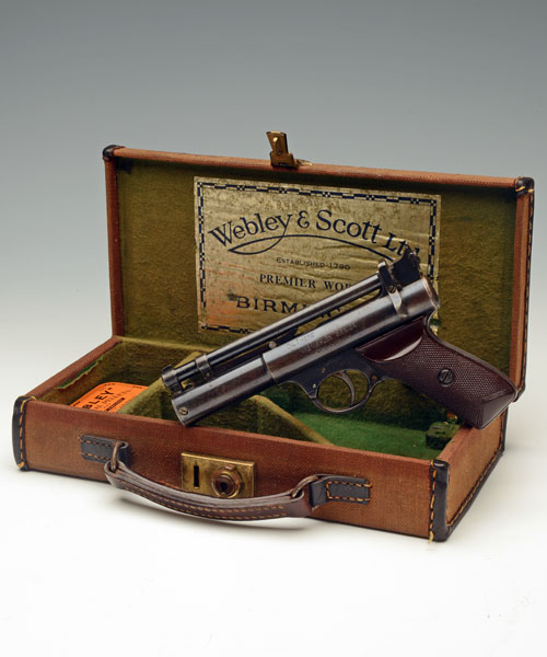 pre-war, with 7in blued, sighted, rifled barrel, the air chamber stamped 'WEBLEY & SCOTT LTD, BIRMINGHAM' and patents to 1925, the left hand side with 'THE WEBLEY SENIOR, MADE IN ENGLAND', brown plastic grips (one small chip to top edge), the whole retaining a good proportion of its original finish, TOGETHER WITH its rare, original manufacturers canvas and leather carry-case, compartmented and lined in green baize, gold coloured trade label to inside of lid and retaining a period orange rectangular tin of 'Webley' .22 special pellets (lining stained, small losses to label)