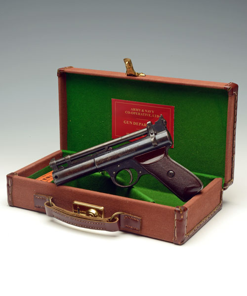 pre-war, with 7in blued, sighted, rifled barrel, the air chamber stamped on the right hand side with 'WEBLEY & SCOTT LTD, BIRMINGHAM' and patents to 1925, the left-hand side with 'THE WEBLEY SENIOR, MADE IN ENGLAND', brown plastic grips, the whole retaining much original finish, TOGETHER WITH a later canvas compartmented carry-case with green baize lining, red trade label in the lid for 'ARMY & NAVY CO-OPERATIVE LTD' and complete with a period orange rectangular tin of 'Webley' .22 special pellets, the case remaining in fine condition
