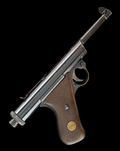 circa 1935, in loose imitation of a 'Luger P08' service pistol, with blued 4in. barrel, automatic sliding tap (securing screw missing), blued air-chamber signed 'HAENEL MOD. 28-R BRIT PAT. NO. 277265 D.R.P.', twist to load aperture at rear, smooth walnut grips with inlaid brass medallions, good amount of original finish remaining