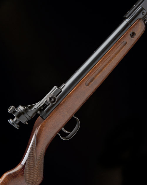 circa 1960, with 17in. barrel, tunnel fore-sight with interchangeable elements, plain air-chamber with model designation, short rail to rear of air-chamber for micro-adjustable aperture sight (present), beech semi-pistol grip half stock chequered at the wrist with finger-grooved fore-end, the metal-work re-finished
