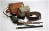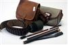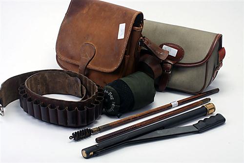 CANVAS & LEATHER CARTRIDGE BAG, along with a leather 20 bore cartridge belt, a leather cartridge bag a cleaning rod, various cleaning rod heads and an air gun pump