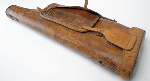 A SINGLE LEATHER LEG-OF-MUTTON GUNCASE, suitable for 29in. barrels, brass lock (key missing), with exterior pocket, canvas sling