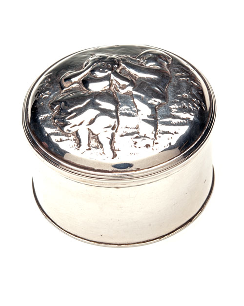 probably pre-war German, tested continental silver, with hinged lid with relief decoration depicting a hunter and his spouse, the hapless lady guarding her ears with her hands, the base of the box with removable velvet lining, approximately 2 1/4in. in diameter