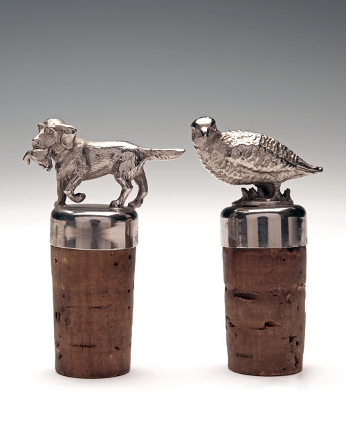 A PAIR OF STERLING-SILVER WINE-BOTTLE STOPPERS IN THE FORM OF A PARTRIDGE AND A DOG,
