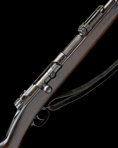 circa 1885, with 32in. sighted barrel, the top of breech signed 'DANZIG' surmounted by a crown, the side of barrel stamped 'FW', surmounted with a crown, round receiver with model designation, straight-handled bolt with flag safe, walnut three-quarter stock with concealed magazine tube under the barrel, bayonet lug to nose-cap, stacking spike to front and fitted with original leather sling