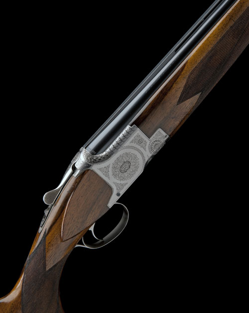 28in. nitro barrels with 8mm ventilated matt top-rib, 2 3/4in. chambers, bored approx. imp. cyl. and 1/4 choke, hold-open toplever, manual safety with integral barrel selector switch, border and scroll engraving with floral bouquets, bright finish, 14 1/2in. pistolgrip stock including 1/2in. rubber recoil pad, weight 7lb. 2oz.