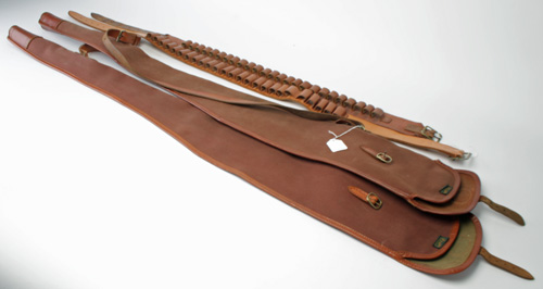 TWO BRADY CANVAS AND LEATHER SINGLE GUNSLIPS together with two leather cartridge belts (4)