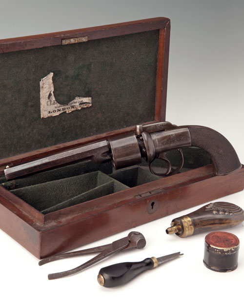 circa 1840, with 5 1/2in. octagonal barrel, nickel bead fore-sight, plain cylinder with border engraved front edge, each chamber numbered '1' to '6', rounded scroll engraved central hammer boxlock action, two-piece walnut chequered grips, border and scroll engraved trigger-guard, the whole retaining traces of colour throughout, TOGETHER WITH its original English market mahogany storage case, compartmented and lined in green baize, containing a period mould, turnscrew and cleaning rod, together with a later flask