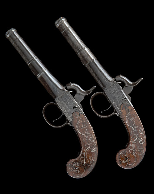 circa 1760, converted from flintlock, with 3in. turn-off rifled cannon-barrels, the breeches stamped with the makers mark for Robert Wheeler, squared border and scroll engraved boxlock central hammer actions signed 'WHEELER' on the left hand side in a banner, slab-sided walnut butts inlaid with silver wire scrolls (small losses to inlays) and sliding trigger-guard safeties