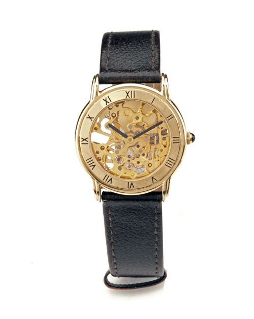 A GOLD-PLATED UNISEX MECHANICAL SKELETAL WRIST-WATCH, serial no. 32600,