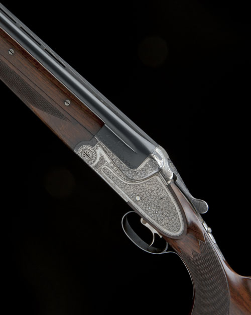 28in. nitro barrels with tapered ventilated matt top-rib, wooden side-fillets, 2 3/4in. chambers, bored approx. 1/2 and 3/4 choke, hold-open toplever, side-bolsters, automatic safety, hand-detachable lockplates with concealed flush release lever, gold-inlaid cocking-indicators, selective single trigger, acanthus scroll engraving, bright finish, 14 3/8in. figured pistolgrip stock including 3/4in. rubber recoil pad, weight 7lb. 12oz.