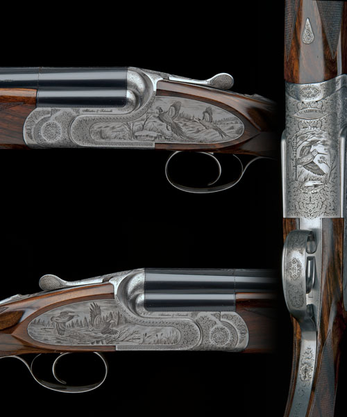 30in. nitro reproved barrels with 9mm solid matt top-rib, 2 3/4in. chambers, Teague multichokes (with spares), hold-open toplever, automatic safety with gold-inlaid 'SAFE' detail, non-selective single trigger, rolled-edge triggerguard, fine floral and acanthus scroll engraving, the pinless lockplates finely engraved in bulino style with game scenes of a brace of cock pheasant on the left and English partridge on the right, the underside with a vignette of a lone woodcock, signed 'D. Bonsi', the triggerplate signed 'L Bertelli', action bar signed 'Abbiatico & Salvinelli', bright finish overall, 15 1/8in. figured pistolgrip stock with engraved steel pistolgrip-cap, weight 7lb. 6oz., in its universal case