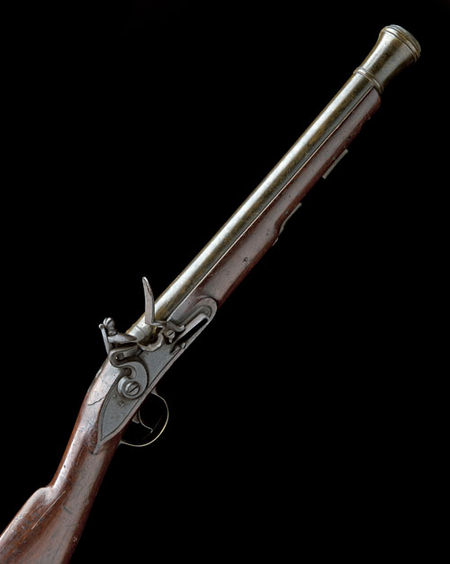 circa 1780, with 15 1/2in. cannon-muzzled barrel, London proofs, Southern Irish registration number to top of barrel, solid squared iron top-tang, flat, slightly curved lock signed 'P. BOND' (faint), unbridled frizzen (hammer sear at fault), walnut three-quarter stock (shrinkage crack alongside tang and chip at toe), brass furniture including serpentine side-plate, the whole dirty and stained, missing ramrod
