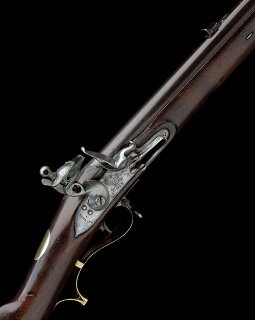 for 1823, with deeply rifled browned 30 1/4in. barrel, dove-tailed brass blade fore-sight, rear-sight with one standing and two folding leaves (later replacement), rounded top-tang, rounded border line engraved lock signed 'W. KETLAND' at the tail and stamped with a crown over 'GR' forwards of the hammer, walnut straight-hand full-stock (old inlet repair behind lock), raised cheek-piece, brass furniture including elongated spurred trigger-guard bow, ramrod channel with expansion slot, iron swivels and replacement iron ramrod (from a Brunswick Rifle)