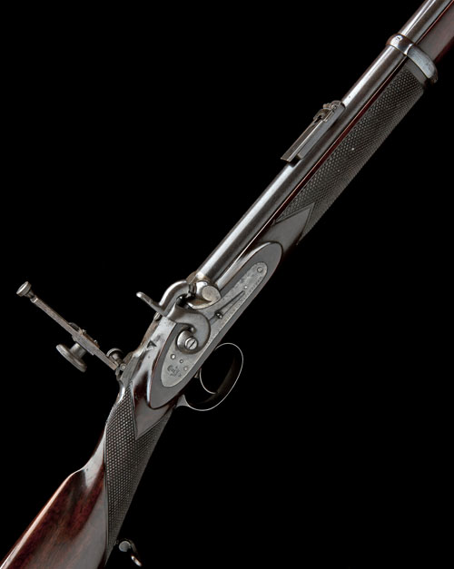 circa 1865, with blued 36in round barrel marked 'WHITWORTH PATENT', recessed muzzle, tunnel micro-adjustable foresight, elevating ladder rear-sight and vernier diopter peep-sight on tang, border lined flat lock plate signed 'WHITWORTH RIFLE CO. MANCHESTER', together with the Whitworth crown trademark, sliding safety forwards of the hammer, french polished walnut full-stock with steel furniture chequered at the wrist and fore-grip, trigger guard inscribed 'BEST', three iron barrel bands and nose cap, steel ramrod, good amount of original finish throughout