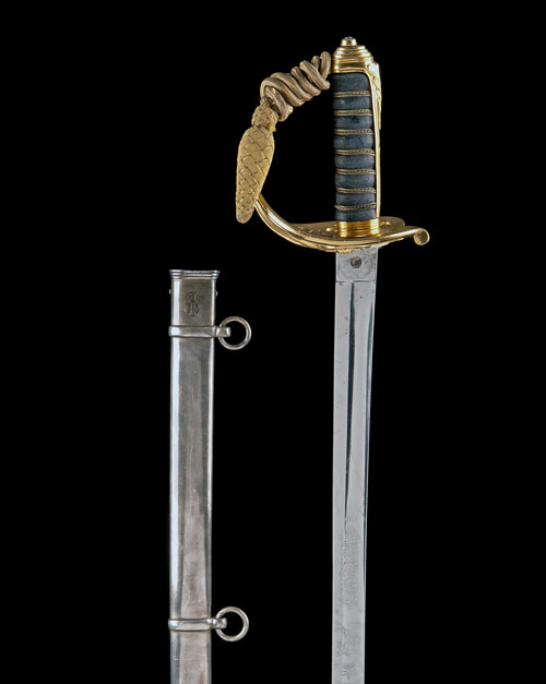 for 1866, with slightly curving 32 1/2in. blade etched with scroll surrounding a Victorian crown over 'VR' to the centre of the blade, the hilt of standard form with later gold-plating, re-bound grip and complete with a bullion sword-knot TOGETHER WITH its steel scabbard with later silver-plating engraved with a 'WR' monogram to the throat