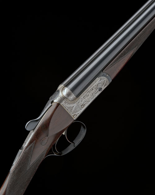 26in. nitro reproved barrels, 2 1/2in. chambers, bored approx. 1/4 and 3/4 choke, manual safety with silver-inlaid 'SAFE' detail, border and scroll engraving, bright finish, 14 1/2in. figured stock, weight 4lb. 2oz.