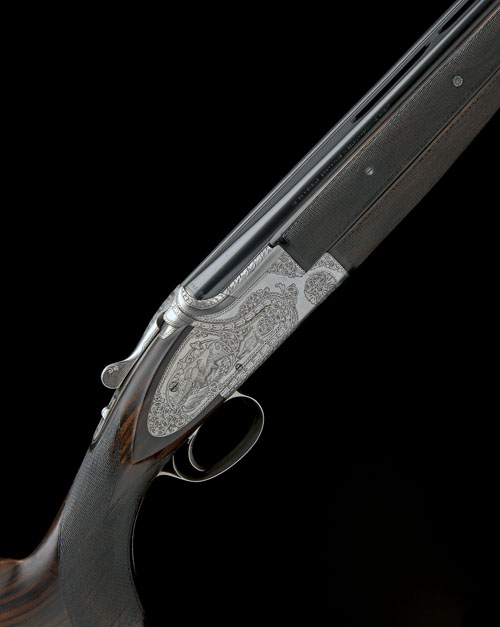 30in. nitro barrels with 12mm ventilated matt top-rib, 2 3/4in. chambers, bored approx. imp. cyl. and 1/4 choke, hold-open toplever, automatic safety with integral barrel selector switch, F1 type engraving, bright finish, 14 1/2in. figured pistolgrip stock including 3/4in. rubber recoil pad, weight 7lb. 14oz.