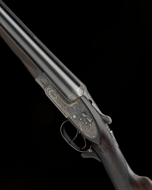 28in. nitro chopperlump barrels, 2 3/4in. chambers, bored approx. 1/4 and 1/2 choke, removable striker discs, automatic safety with gold-inlaid 'SAFE' detail, hand-detachable lockplates, gold-inlaid cocking-indicators, articulated front trigger, rolled-edge triggerguard, bouquet and scroll engraving, retaining traces of original colour-hardening and finish, 15 1/8in. figured stock, weight 6lb. 11oz.