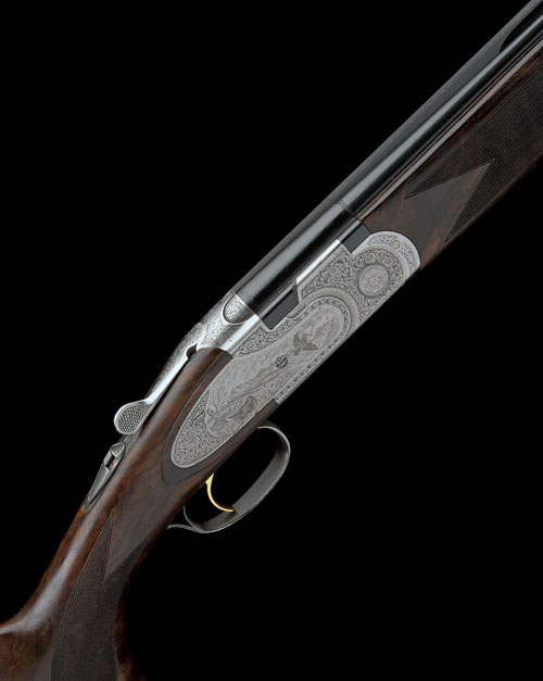 28in. nitro barrels with 6mm ventilated matt top-rib, 3in. chambers, multichokes (with spares), hold-open toplever, automatic safety with integral barrel selector switch, gold-washed single trigger, floral scroll engraving, the sideplates engraved with scenes of pheasant and woodcock, old silver finish, 14 1/2in. pistolgrip stock including wooden buttplate, weight 6lb. 8oz.