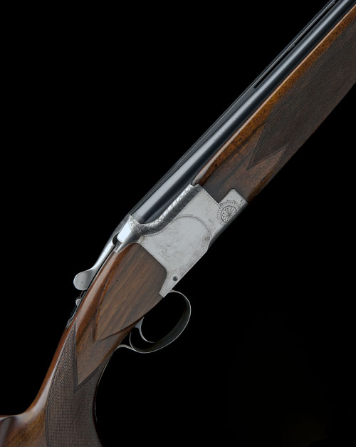 26 1/4in. nitro barrels with 8mm ventilated matt top-rib, 2 3/4in. chambers, bored approx. imp. cyl. and 1/4 choke, hold-open toplever, manual safety with integral barrel selector switch, border engraving, brushed bright finish, 15in. pistolgrip stock including 2 1/4in. wooden extension and ventilated rubber recoil pad, weight 7lb. 8oz.