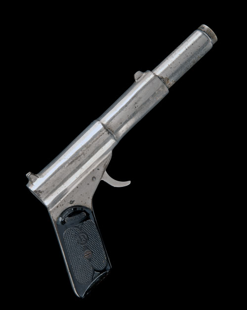 by Frank Clark, Birmingham, circa 1925, with push-in 5in. smooth-bore barrel (complete, but does not hold), plain stepped receiver, slanted grip with hard-rubber chequered grips impressed with 'MADE IN ENGLAND and a gothic letter 'B' on the right-hand side and 'THE BRITON' with the same letter on the left, no trigger-guard, retaining virtually all its original nickel-plate