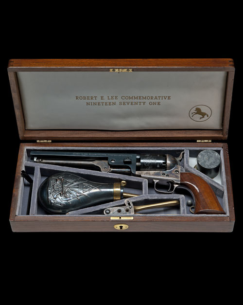 made in 1971, with blued octagonal 7 1/2in. barrel, plain cylinder with roll-engraved scene, colour case-hardened frame, silver-plated grip-straps and trigger guard, smooth walnut one-piece grip, TOGETHER WITH its factory wood presentation case lined in Confederate grey velvet with a satin lining to lid, the inside of lid gold lettered 'ROBERT E. LEE COMMEMORATIVE, NINETEEN SEVENTY ONE' and complete with all its original accessories including mould, flask cap-tin and nipple-key, the whole remaining in fine order and appearing unused with its factory card carton and some papers
