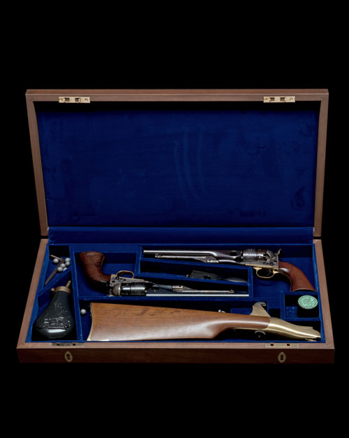 made in 1977, with blued round 8in. barrels, plain cylinders with roll-engraved scenes, colour case-hardened frames, brass grip-straps and trigger guards, smooth walnut one-piece grips with martial stamps, TOGETHER WITH their factory wood presentation case lined in Union blue velvet and complete with all their original accessories including a wood and brass detachable shoulder-stock, mould, crank-top flask, cap-tin and nipple-key, the whole remaining in fine order and appearing unused with its factory card carton and papers