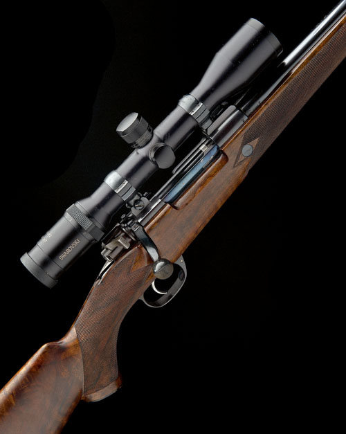 22 5/8in. unsighted nitro barrel engraved in gothic script 'JOHN RIGBY & CO. 13 PALL MALL. LONDON. S.W.1.', receiver (with thumb cutout) engraved 'JOHN RIGBY & CO LONDON ENGLAND', and mounted with a Swarovski 1,5-6x42 Habicht telescopic sight, recoil block, hinged floorplate engraved 'RIGBY'S 270 WIN' and with push-button release, triggerguard gold-inlaid with the serial number, well-figured pistolgrip stock with cheekpiece, sling eyes, horn pistolgrip-cap (repaired crack at hand), 14 5/8in. pull including 1/2in. rubber recoil pad, in a full length alloy flight case