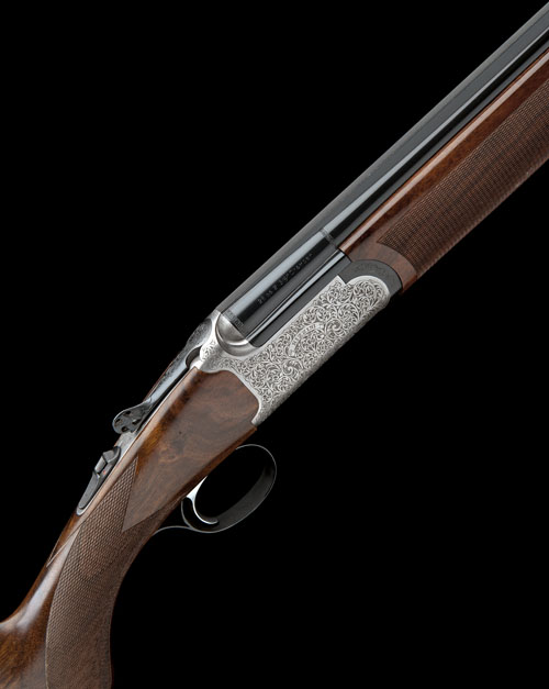 29 1/4in. nitro barrels with 8mm raised matt top-rib, 2 3/4in. chambers, multichokes (with spares), pierced hold-open toplever, automatic safety with integral barrel selector switch, acanthus scroll engraving surrounding a banner containing the makers name, the underside engraved 'ROUND BODY', matt silver finish, 15in. semi-pistolgrip stock including 3/4in. wooden extension, weight 6lb., in its makers carton