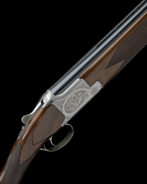 27 1/2in. ported nitro barrels with 6mm ventilated matt top-rib, 2 3/4in. chambers, multichokes (with spares), hold-open toplever, manual safety with integral barrel selector switch, acanthus scroll engraving surrounding vignettes of game, silver finish, 13 3/4in. stock including buttplate, weight 6lb. 15oz.