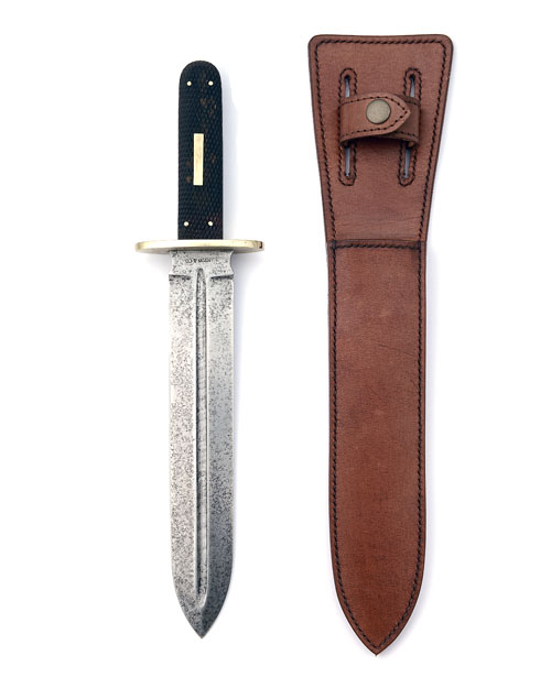 9in. double-edged spear point blade with central fuller, brass crosspiece, chequered grips