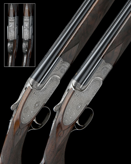 28 3/8in. nitro barrels with 7mm ventilated matt top-ribs and side ribs, the undersides signed 'R. Luterotti', 2 3/4in. chambers, multi-chokes (with spares), hold-open toplevers, gold-inlaid '1' and '2', automatic safeties, non-selective single triggers, the actions, lockplates and furniture with intricately interwoven fine floral and foliate motifs bordering very fine acanthus scrollwork, the undersides with finely engraved, Bulino style, vignettes of pheasant and woodcock in flight, the triggerguards with portraits of the same, the fore-end irons engraved en suite, triggerplates signed 'NAIDA', old silver finish, 14 1/2in. well-figured pistolgrip stocks including 1in. leather covered recoil pads, weight 7lb. 2oz., in their leather case with canvas outer