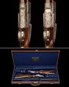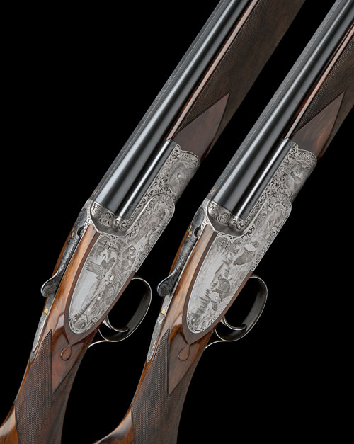30in. nitro barrels with raised solid matt top-ribs, gold-inlaid '1' and '2 at the breech ends, side-ribs, over barrels engraved in script 'LUCIANO BOSIS. BRESCIA. ITALY', 3in. chambers, bored approx. 1/4 and 1/2 choke, hold-open toplevers gold-inlaid '1' and '2', automatic safeties with gold-inlaid 'S' details in a roundel, non-selective single triggers, the actions, lockplates and furniture very finely carved in low relief with flowing acanthus scrollwork, foliole and floral motifs and a darkly matted background, the fore-ends engraved en suite, action bars with very fine vignettes of partridge and pheasant and the lockplates exquisitely engraved in bulino style with various scenarios of game birds at leisure, the undersides with further scenes of woodcock and capercaillie, the triggerplates signed 'Pasotti 1999', bright finish overall, 14 3/4in. highly-figured stocks with Prince of Wales semi pistolgrips, weight 6lb. 10oz., in their lightweight leather case with accessories
