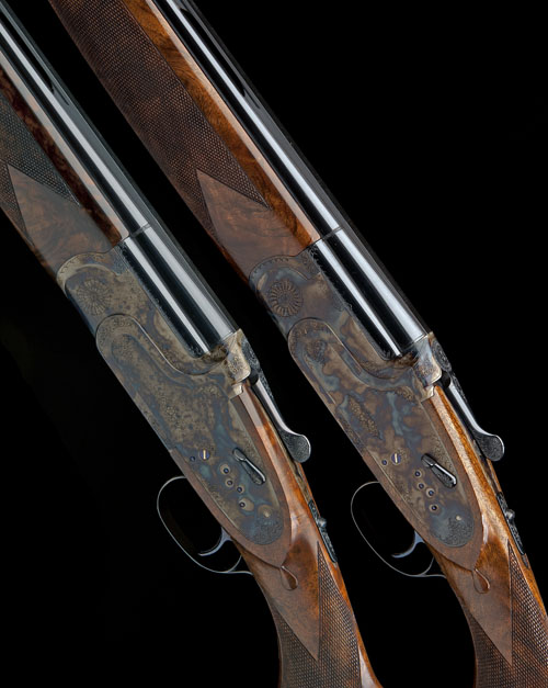 30in. nitro barrels with 8mm ventilated matt top-ribs, 3in. chambers, multi-chokes, hold-open toplevers, manual safeties, hand-detachable lockplates, gold-inlaid cocking-indicators, non-selective single triggers, actions and lockplates partially engraved with floral and scroll motifs, the undersides gold-inlaid 'JENSON', retaining virtually full original colour-hardening and finish, 14 5/8in. figured semi-pistolgrip stocks, weight 7lb. 4oz.,