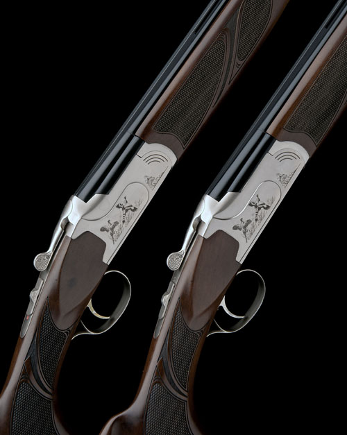 28in. nitro barrels with 7mm ventilated matt top-ribs, 3in. chambers, bored approx. true cyl. in all, hold-open toplevers, manual safeties with integral barrel selector switches, actions engraved with pheasants in flight, satin finishes, 14 1/2in. pistolgrip stocks including 3/4in. rubber recoil pads, sling swivels, weight 6lb. 5oz. and 6lb. 3oz. respectively