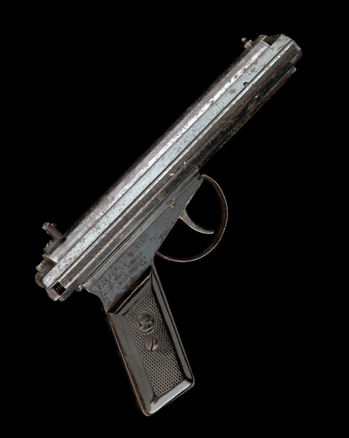 circa 1930, with concealed 7 1/2in. barrel, blued air-chamber with bead fore-sight and rear-sight adjustable for elevation, blued side-lever with rear locking-catch, blued frame marked 'F. CLARKE'S PATENT NO.'S BRIT 351268, USA 538057' on the right hand side and 'THE WARRIOR MADE BY ACCLES AND SHELVOKE LTD, BIRMINGHAM' on the left, chequered hard-rubber grips embossed with a knight's helmet and pressed trigger-guard bow, the whole retaining much original finish under some surface corrosion (trigger-spring at fault)