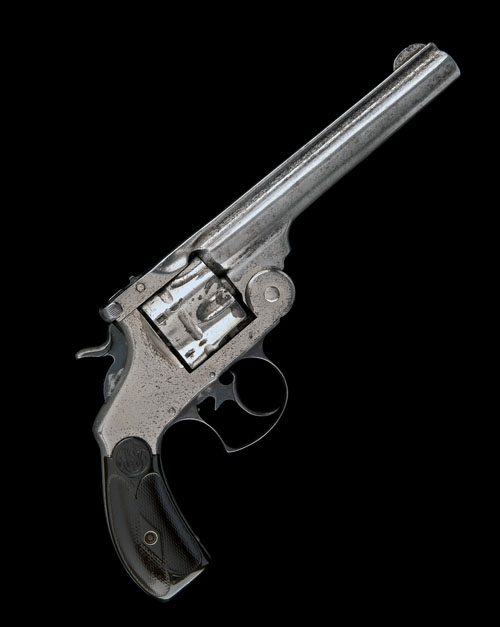 circa 1885, with 6in. sighted barrel, raised top-rib (makers details erased), fluted cylinder, break-open frame with automatic ejection mechanism, chequered hard-rubber grips embossed with the Smith & Wesson trademark, blued hammer, trigger and trigger-guard bow, the remainder with fair traces of original nickel-plate.