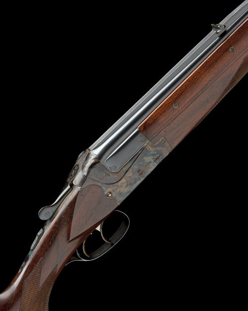 25 1/2in. nitro barrels with ramp-mounted blade fore-sight, sighting flat with rear open-sights, wooden side-fillets, bolstered scroll-back action with hold-open toplever, automatic safety, cocking-indicators, set front trigger, retaining virtually full original colour-hardening and finish, 14 1/2in. pistolgrip stock with cheekpiece, sling swivels and including buttplate, weight 7lb. 11oz.