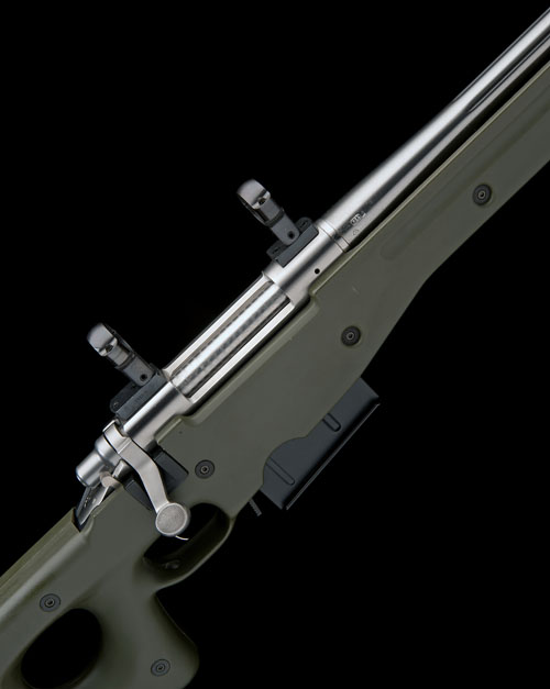26in. unsighted fluted nitro barrel, stainless receiver with telescopic sight mount bases and rings, detachable box magazine marked 'AI', Accuracy International type synthetic thumbhole stock with adjustable buttplate