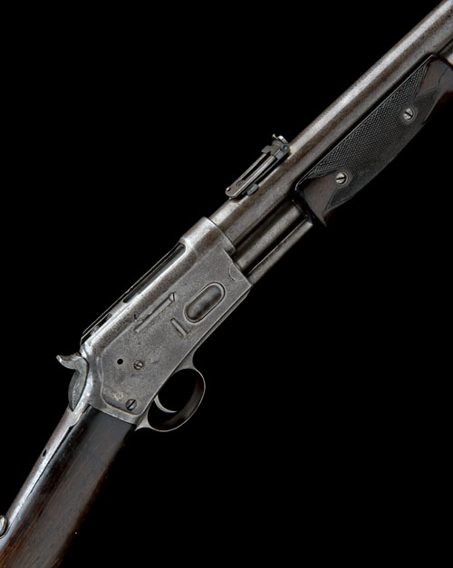 for 1888, with round 20in. barrel, block and blade fore-sight, elevating notch and ladder rear-sight, the top of barrel with makers details and patent dates (rubbed), internal sliding bolt (missing dust-cover) and external hammer, plain receiver with sprung loading gate on right hand side, saddle-ring mounted on left hand side, walnut butt-stock with iron semi-crescent butt-plate (losses to wood around head of stock, hand screw replaced), under-barrel full-length magazine tube with sliding pump-handle with chequered walnut grips, finish worn throughout