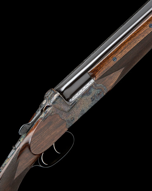23 3/4in. nitro barrels with raised matt rib, flip-up open sights and bead fore-sight, wooden side fillets, bolstered scroll-backed treble-grip action, hold-open toplever, manual safety, set front trigger, acanthus scroll engraving, retaining virtually full original colour-hardening and finish, 14 1/2in. figured pistolgrip stock, weight 7lb. 15oz., in a universal case