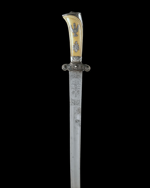 French, circa 1780, with slightly curving 22 1/2in. blade, one wide and one narrow fuller to each side (tip re-profiled), engraved panels to both sides at the forte, short hollow silver cross-guard with spiral finials, ivory grip-piece with applied silver motifs, silver back-strap and capped pommel