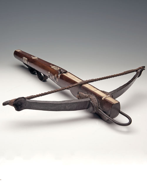 German, circa 1790, with iron prod and multi-strand gut string, walnut full-stock with bone inlays for the bolt-guide and further isolated bone decorative inlays, carved 'violin' cheek-rest, elongated iron trigger-guard bow, hand-stop notch to fore-stock and iron loop to front for toe-hook
