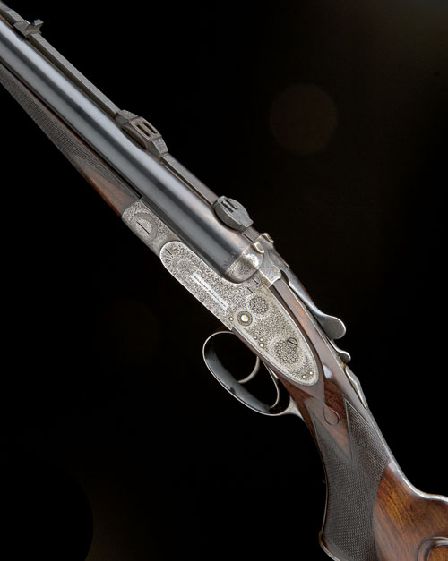 23 3/4in. replacement nitro chopperlump barrels by Waffen Furtshegger (Kufstein) with raised matt rib, open sights and ramp-mounted bead fore-sight, the breech end with quickly-detachable telescopic mount bases, action with raised fences, elongated top strap with bolted automatic safety, gold-inlaid 'SAFE' detail, gold-inlaid cocking-indicators, fine bouquet and scroll engraving, retaining slight traces of original colour-hardening, 14 5/8in. well-figured pistolgrip stock with cheekpiece, sling swivels, engraved steel pistolgrip-cap and including 1in. rubber recoil pad, weight 9lb. 8oz., in a canvas and leather case with John Rigby trade label